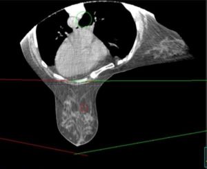 We treat the patient in a prone position, causing the breast to fall away from the chest. This enables us to direct the beam of radiation to the breast but not the chest, reducing radiation exposure to the heart and lungs.